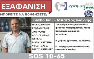 Ο Baxho Jani - Μπάτζιος Ιωάννης, που εξαφανίστηκε στις 29 Ιουλίου από τον Πειραιά έχει καστανά μάτια, ύψος 1,70μ. και βάρος κανονικό. Την ημέρα που εξαφανίστηκε φορούσε λαδί βερμούδα, λευκό πουκάμισο και μαύρα παπούτσια. Η ζωή του βρίσκεται σε κίνδυνο.