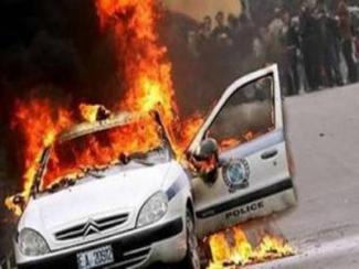Άγνωστοι με καλυμμένα τα πρόσωπά τους, αφού είχαν κατέβει από το περιπολικό οι αστυνομικοί, πέταξαν βόμβες μολότοφ με αποτέλεσμα να τυλιχθεί στις φλόγες.