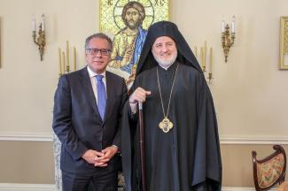 Ακόμα, ο κ. Κουμουτσάκος έγινε δεκτός από τον Σεβασμιότατο Αρχιεπίσκοπο Αμερικής κ. Ελπιδοφόρο. Η συνάντηση είχε ως βασικό αντικείμενο την ενημέρωση της Αρχιεπισκοπής της Αμερικής για την κατάσταση που επικρατεί στην Ανατολική Μεσόγειο στο μεταναστευτικό "μέτωπο" και την πρόσφατη έξαρση των μεταναστευτικών ροών που καταφθάνουν στην Ελλάδα, με σκοπό την περαιτέρω ευαισθητοποίηση και ενημέρωση της ομογένειας και των αμερικανικών θεσμών για το σοβαρό αυτό ζήτημα.