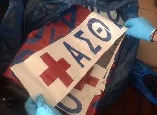 Στη γιάφκα του Χολαργού οι αστυνομικοί βρήκαν ένα σάκο με αυτοκόλλητα που είχαν την ένδειξη ασθενοφόρο, αλλά και την ιατρική μονάδα στην οποία υποτίθεται ότι ανήκε.