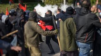 'Οταν οι αστυνομικοί επιχείρησαν να τους απομακρύνουν σημειώθηκε συμπλοκή και οι αντιεξουσιαστές επιτέθηκαν με τα κοντάρια από τις σημαίες που κρατούσαν, ενώ, σύμφωνα με πληροφορίες, τουλάχιστον δύο αστυνομικοί έχουν χτυπήσει στο κεφάλι.