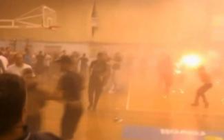Ένας οπαδός, ακόμα, δεν δίστασε να κάνει χρήση πυροσβεστήρα, με την ατμόσφαιρα να γίνεται αποπνικτική. Το ματς διεκόπη με το σκορ στο 61-51 και ο αγώνας δεν ολοκληρώθηκε ποτέ λόγω της έκτασης των επεισοδίων.