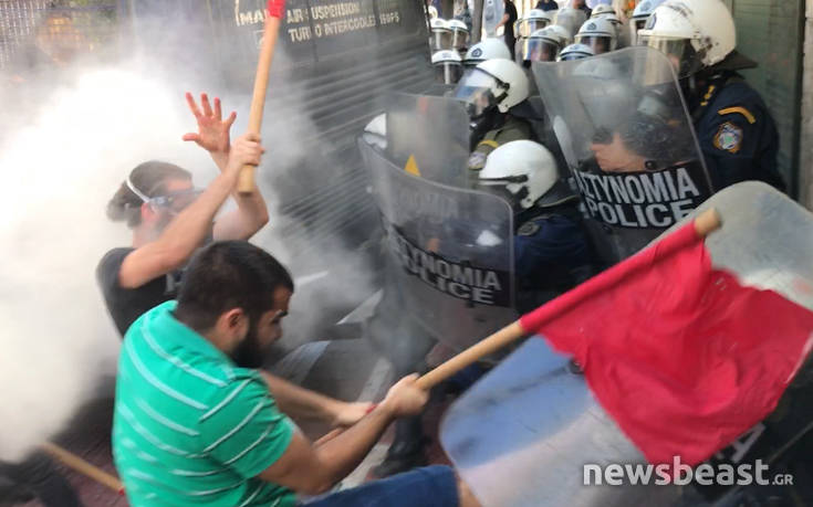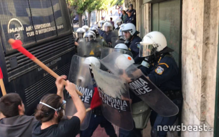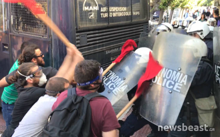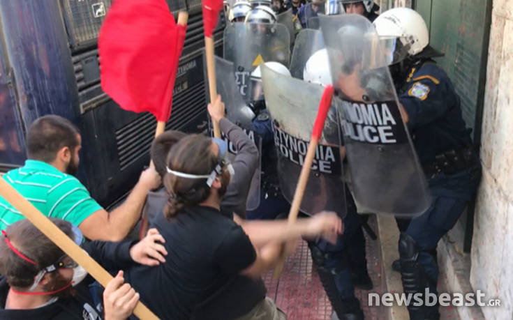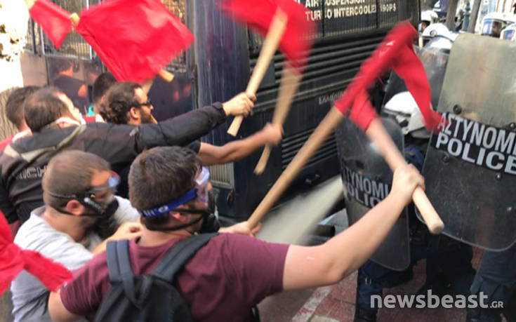 Ένταση σημειώθηκε στη φοιτητική πορεία το μεσημέρι της Πέμπτης, όταν διαδηλωτές επιτέθηκαν με ξύλα στους αστυνομικούς των ΜΑΤ.
