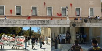 Η επίσκεψη της αναρχικής ομάδας στο ελληνικό Κοινοβούλιο είχε αισθητική παρέμβαση, αφού τα μέλη της πέταξαν κόκκινες μπογιές και καπνογόνα.
