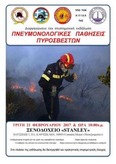 Από κοινού η ΕΑΠΣ, η ΠΟΕΥΠΣ, και η ΠΕΕΠΣ, με την αιγίδα της Ελληνικής Πνευμονολογικής Εταιρείας διοργανώνουμε την Τρίτη 21 Φεβρουαρίου 2017 και ώρα 10:00 με 13:00 επιστημονική εκδήλωση με θέμα «Πνευμονολογικές Παθήσεις Πυροσβεστών».
