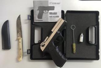 Κατά τη διάρκεια της έρευνας βρέθηκαν και κατασχέθηκαν πιστόλι με τον γεμιστήρα του, μαχαίρι και διάφορα εξαρτήματα (σχοινοκαθαριστήρας, φλογοκρύπτη).