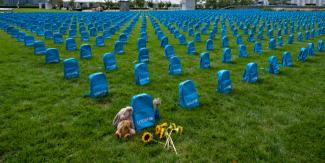 Πάνω από 3.700 γαλάζιες σχολικές τσάντες στήθηκαν σε σειρές, κατά τρόπο ώστε να θυμίζουν επιτύμβιες πλάκες σε νεκροταφείο, σε μια εγκατάσταση η οποία αποκαλύφθηκε χθες Κυριακή έξω από το κτίριο των Ηνωμένων Εθνών στη Νέα Υόρκη, για να προσελκύσει την προσοχή στον αριθμό των παιδιών που σκοτώνονται και ακρωτηριάζονται σε εμπόλεμες ζώνες.