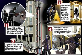Σύμφωνα με την εφημερίδα Sun τα μέλη της συμμορίας τρύπησαν τον τοίχο περνώντας μέσα από το φρεάτιο του ασανσέρ του κτιρίου την Παρασκευή. Την ημέρα εκείνη τα πάντα στη συνοικία του Χάτον Γκάρντεν -όπου στεγάζονται περισσότερα από 50 καταστήματα και 300 έμποροι διαμαντιών, χρυσού και πολύτιμων λίθων- ήταν κλειστά για το Πάσχα των Καθολικών.