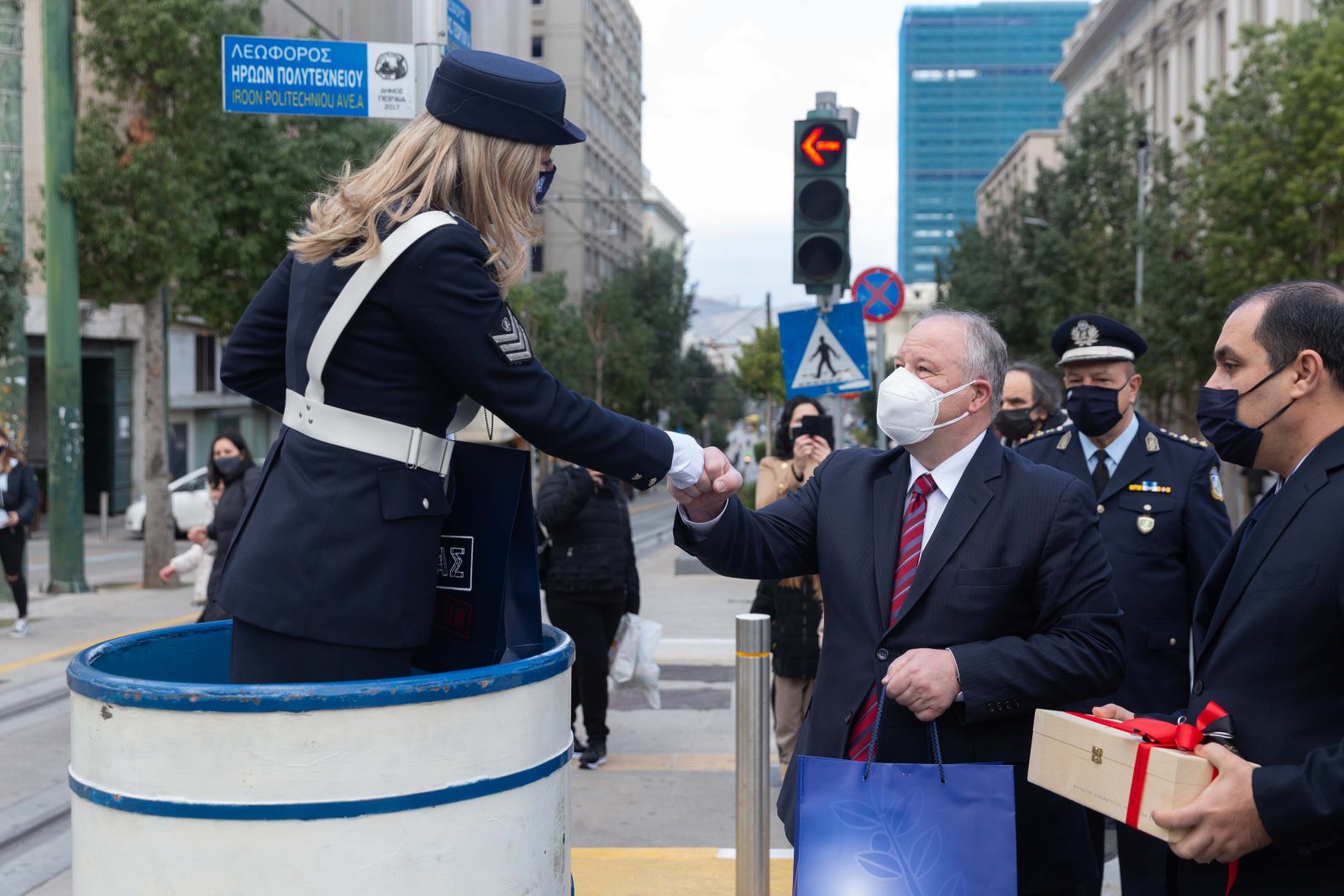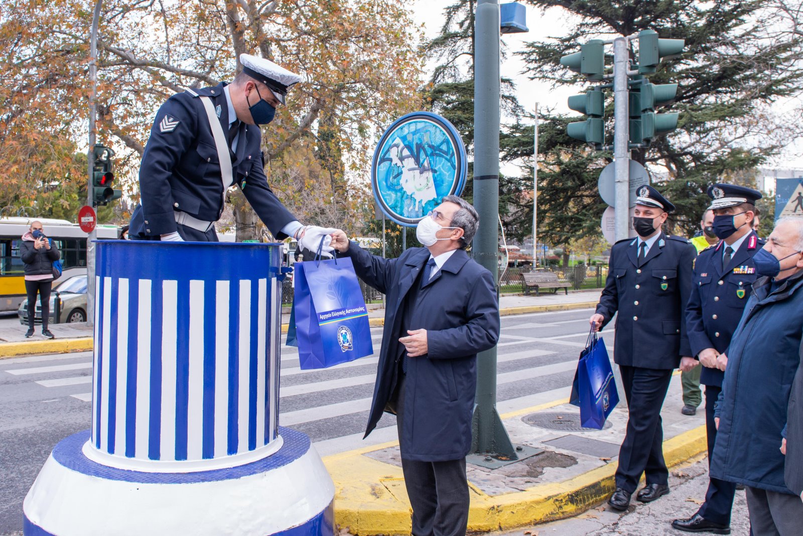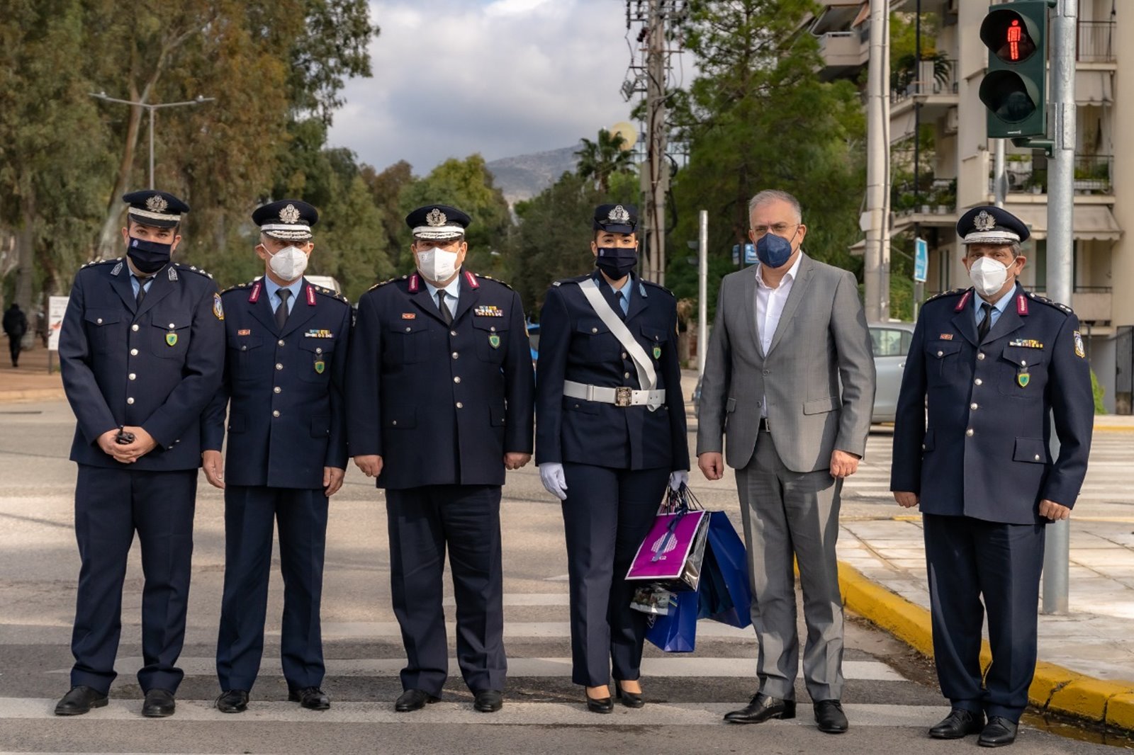 Ο Υπουργός Προστασίας του Πολίτη Παναγιώτης Θεοδωρικάκος, ο Υφυπουργός Ελευθέριος Οικονόμου, ο Γενικός Γραμματέας Κωνσταντίνος Τσουβάλας και ο Αρχηγός της Ελληνικής Αστυνομίας Αντιστράτηγος Μιχαήλ Καραμαλάκης επισκέφτηκαν σήμερα το πρωί τροχονόμους στο κέντρο της Αθήνας, στα νότια, στα δυτικά και στα βόρεια προάστια. Στα συγκεκριμένα σημεία όπως ορίζει η παράδοση μοιράστηκαν δώρα και έγινε ανταλλαγή ευχών για τη νέα χρονιά.