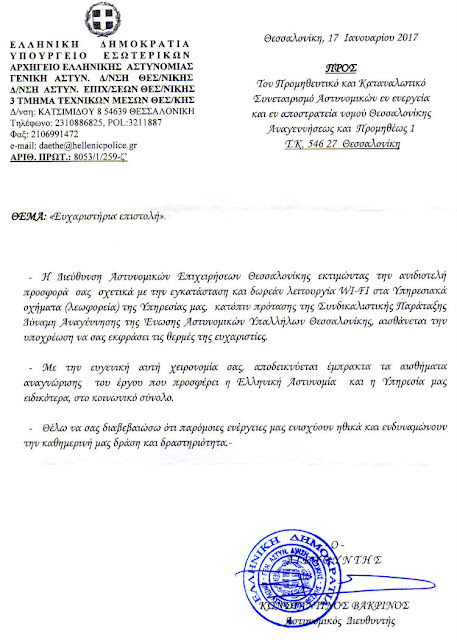 Η Διεύθυνση Αστυνομικών Επιχειρήσεων Θεσσαλονίκης, μετά από Διαταγή του Αρχηγείου της Ελληνικής Αστυνομίας, απέστειλε στον Συνεταιρισμό Αστυνομικών Θεσσαλονίκης την παρακάτω ευχαριστήρια επιστολή: