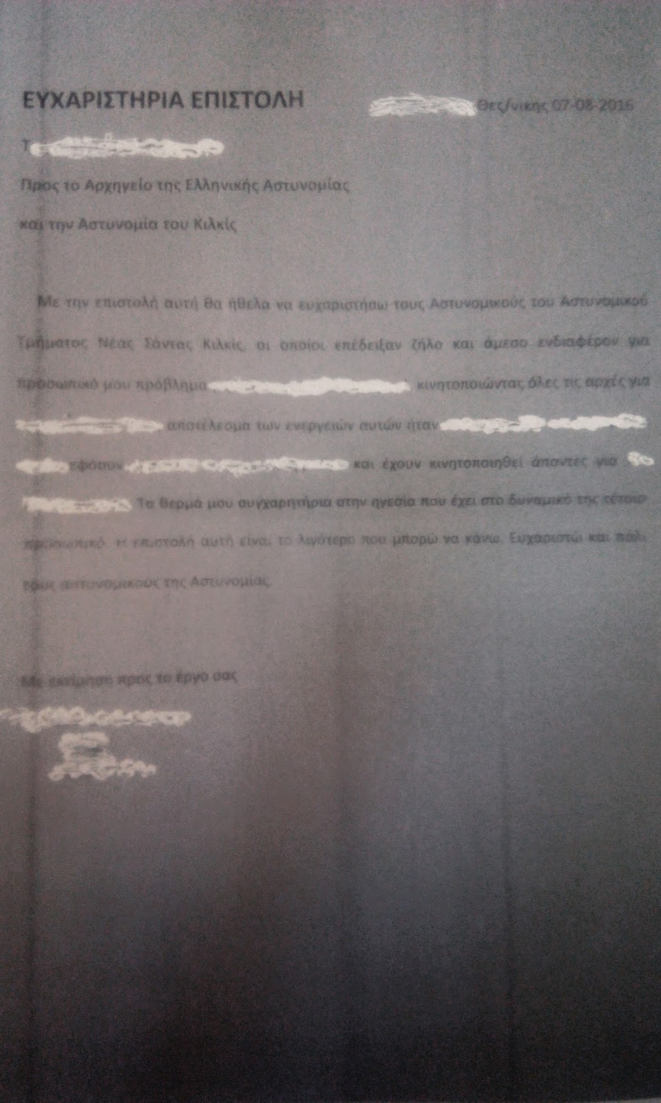 Το Α.Τ. Νέας ΣΑΝΤΑΣ Κιλκίς έλαβε την συνημμένη επιστολή η οποία ευχαριστεί τους αστυνομικούς της δύναμης του για τον ζήλο και το ενδιαφέρον που επέδειξαν για ζήτημα που άπτεται των αρμοδιοτήτων, λαμβάνοντας τα ευμενή σχόλια των πολιτών και διατηρώντας σε υψηλό βαθμό το επίπεδο αισθήματος ασφαλείας των πολιτών και το κύρος του σώματος κατ επέκταση.