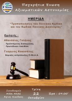 Η εν λόγω ημερίδα με θέμα «Τροποποιήσεις του Ποινικού Κώδικα και του Κώδικα Ποινικής Δικονομίας» προγραμματίστηκε για την ερχόμενη Τρίτη 22 Οκτωβρίου 2019 και ώρα 09:00΄ στο συνεδριακό χώρο του Ξενοδοχείου MIRA MARE στον Άγιο Νικόλαο Λασιθίου.