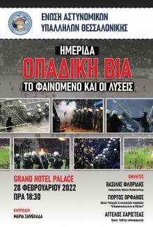 Η Ένωση Αστυνομικών Υπαλλήλων Θεσσαλονίκης, θέλοντας να συμβάλλει ενεργά στις δράσεις για τον τερματισμό της βίας, αποφάσισε να διοργανώσει και σας προσκαλεί να παρευρεθείτε στην Ημερίδα για την οπαδική βία, που θα πραγματοποιηθεί τη Δευτέρα 28 Φεβρουαρίου 2022 και ώρα 18.30 στο ξενοδοχείο «Grand Hotel Palace» (Μοναστηρίου 305).