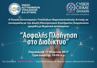 Η Ένωση Αστυνομικών Υπαλλήλων Βορειοανατολικής Αττικής (Ε.ΑΣ.Υ.Β/Α.Α.) σε συνεργασία με την Δίωξη Ηλεκτρονικού Εγκλήματος, πρόκειται να πραγματοποιήσουν ημερίδα με θέμα «Ασφαλής πλοήγηση στο διαδίκτυο», την Παρασκευή 17 Μαρτίου 2017 και ώρα 10:00 στο ξενοδοχείο SEMIRAMIS, Χαριλάου Τρικούπη 48 - Κηφισιά, ισόγειο, αίθουσα Omni& Kismet.