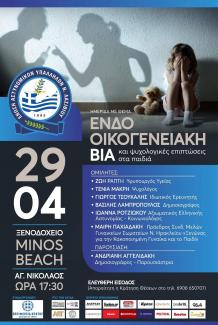 Η Ένωσή μας, θέλοντας να ευαισθητοποιήσει και να αναδείξει το κοινωνικό πρόβλημα της ενδοοικογενειακής βίας, διοργανώνει με την στήριξη της Περιφέρειας Κρήτης, ημερίδα με θέμα «Ενδοοικογενειακή Βία και οι ψυχολογικές επιπτώσεις στα παιδιά».
