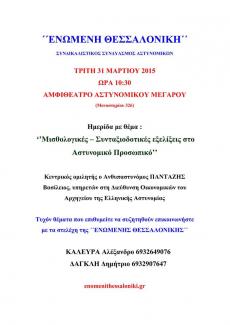Μετά από απαίτηση πολλών συναδέλφων, που επιθυμούσαν υπεύθυνη και ουσιαστική ενημέρωση για τις Μισθολογικές και Συνταξιοδοτικές εξελίξεις στον εργασιακό μας χώρο, ο συνδυασμός μας, ‘’ΕΝΩΜΕΝΗ ΘΕΣΣΑΛΟΝΙΚΗ’’, ανταποκρίθηκε άμεσα διοργανώνοντας Ημερίδα με θέμα : ‘’Μισθολογικές – Συνταξιοδοτικές εξελίξεις στο Αστυνομικό Προσωπικό’’ και κεντρικό ομιλητή τον Ανθυπαστυνόμο ΠΑΝΤΑΖΗ Βασίλειο, υπηρετών στη Διεύθυνση Οικονομικών του Αρχηγείου της Ελληνικής Αστυνομίας την ερχόμενη Τρίτη 31 ΜΑΡΤΙΟΥ 2015 και ώρα 10.30 στο Αμφιθέατρο του Αστυνομικού Μεγάρου Θεσσαλονίκης.