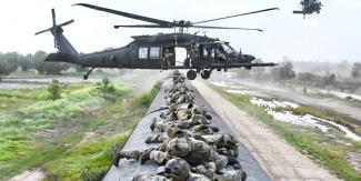 Στην παρακάτω φωτογραφία μέλη της 1ης ομάδας ειδικών δυνάμεων του Στρατού των ΗΠΑ πραγματοποιούν επίθεση από ελικόπτερο σε ένα κινούμενο τρένο. Σε αυτή την περίπτωση, το πολεμικό ελικόπτερο MH-60M που ανήκει στο αμερικανικό Σμήνος Αεροπορίας Ειδικών Επιχειρήσεων, χρησιμοποιείται ως πλατφόρμα παράδοσης ομάδας επίθεσης.