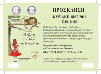 Οι Ενώσεις Βορειοανατολικής και Νοτιοανατολικής Αττικής διοργανώνουν θεατρική παράσταση για τους μικρούς τους φίλους. HΑλίκη θα ταξιδέψει τα παιδιά των μελών των δύο Ενώσεων στην χώρα των θαυμάτων.