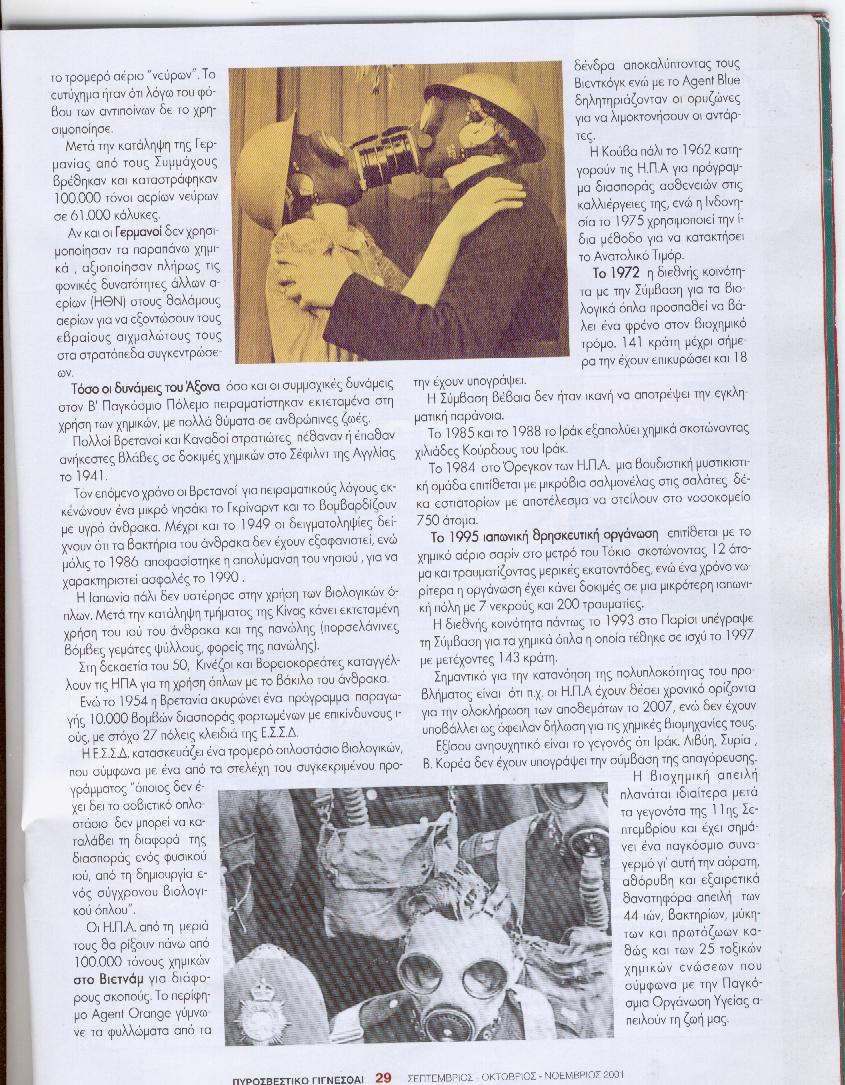 Πριν 18 χρόνια, στο περιοδικό "Πυροσβεστικό Γίγνεσθαι" σημειώναμε για την παρουσία του βιοχημικού τρόμου στην ιστορία, περιγράφοντας σε ένα μικρό δισέλιδο την ιστορική διαδρομή της χρήσης των βιοχημικών όπλων.