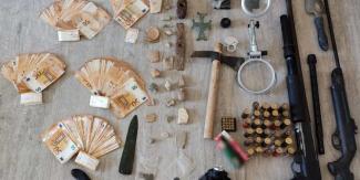 - αντικείμενα που εμπίπτουν στην Νομοθεσία περί Αρχαιοτήτων (μεταλλικός σταυρός, μεταλλική λάμα, μεταλλική κεφαλή σφυριού, μολυβένια αντικείμενα),