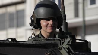 Και ξαφνικά ένα φρέσκο γυναικείο πρόσωπο ξεπροβάλει μέσα από ένα τεθωρασκισμένο που ετοιμάζεται να παρελάσει για την επέτειο της 25ης Μαρτίου!