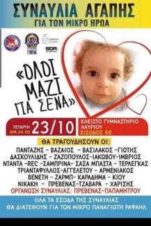 Ειδικότερα την Τετάρτη 23/10/2019 και ώρα 20:00΄ θα πραγματοποιηθεί συναυλία στο κλειστό γυμναστήριο Λαυρίου με την συμμετοχή πολλών καλλιτεχνών, τα έσοδα της οποίας θα διατεθούν στον μικρό Παναγιώτη Ραφαήλ με στόχο την βοήθεια αυτού του μικρού ήρωα της ζωής.