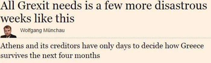 Αυτό που χρειάζεται για ένα Grexit είναι μερικές ακόμα καταστροφικές εβδομάδες σαν και αυτήν γράφει ο Bόλφγκανγκ Μουντσάο στους FT. Ο ίδιος επισημαίνει ότι πολιτικά η κατάσταση είναι τόσο κακή όσο ήταν το 2010 όταν ξεκίνησε η κρίση χρέους. Η Ελλάδα και οι ευρωπαίοι πιστωτές της έχουν μόνο λίγες μέρες για να αποφασίσουν πως θα καταφέρει να επιβιώσει η χώρα τους επόμενους μήνες. Μόνο ένα επιτευχθεί συμβιβασμός τις επόμενες μέρες θα μπορέσουν οι δύο πλευρές να αρχίσουν να μιλούν για τα ουσιαστικά- όπως το μέλλον της ελληνικής οικονομίας.