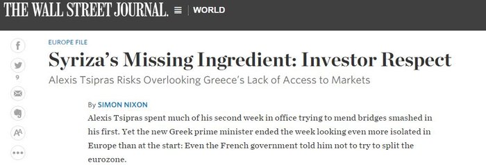 Ο ΣΥΡΙΖΑ χάνει ένα συστατικό: τον σεβασμό των επενδυτών σχολιάζει ο Σάιμον Νίξον στην WSJ μετά τις προγραμματικές δηλώσεις του πρωθυπουργού. Ο Νίξον επισημαίνει ότι ο Αλέξης Τσίπρας κινδυνεύει να παραβλέψει την έλλειψη πρόσβασης της Ελλάδας στις αγορές. Με τις προγραμματικές δηλώσεις προετοίμασε το κλίμα για αυτό που κατά πάσα πιθανότητα θα είναι μια κρίσιμης σημασίας αναμέτρηση.