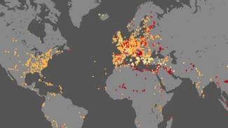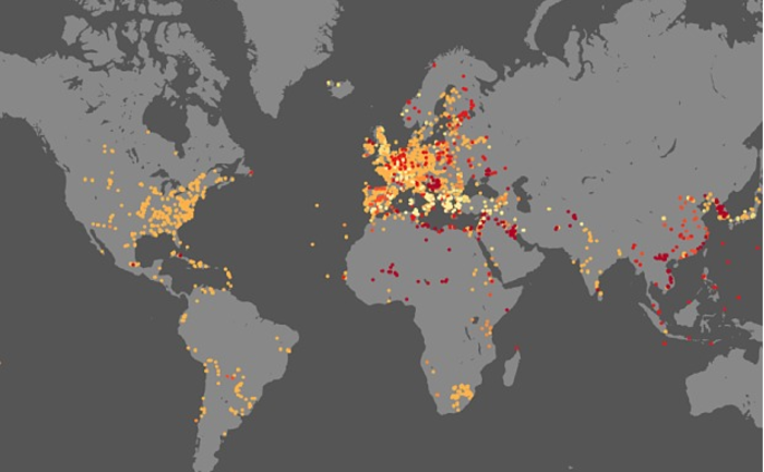 Βασισμένος σε στοιχεία του Wikipedia, ο χάρτης καταγράφει τα σημεία στα οποία έλαβαν χώρα 12,703 πολεμικές μάχες από το 2.500 π.Χ. μέχρι σήμερα.