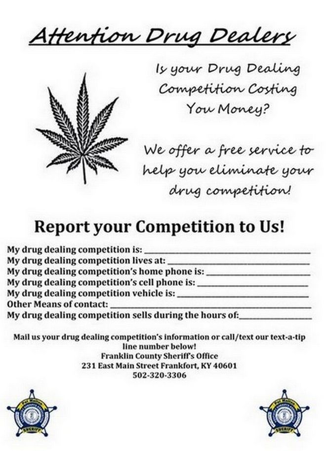 Εναν διαφορετικό τρόπο για να περιορίσει την πώληση ναρκωτικών στην περιοχή του βρήκε ο σερίφης της κομητείας Franklin (Οχάιο), ζητώντας πληροφορίες για τους εμπόρους ναρκωτικών από τους ανταγωνιστές τους.