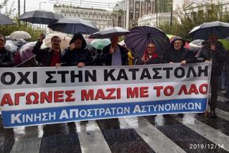 Οι απόστρατοι που δραστηριοποιούμαστε στην ΚΙΝΗΣΗ ΑΠΟΣΤΡΑΤΩΝ ΑΣΤΥΝΟΜΙΚΩΝ, μαζί με τους συναδέλφους που αψήφισαν τις αντίξοες καιρικές συνθήκες και ήρθαν από την επαρχία και τους συναδέλφους των αγωνιστικών Ενώσεων των Ενόπλων Δυνάμεων και των Σωμάτων Ασφαλείας που συντάχθηκαν πίσω από το πανό μας, διατρανώσαμε για μια ακόμη φορά την αποφασιστικότητα των αποστράτων να συνεχίσουν τον αγώνα ενάντια στις αντιλαϊκές πολιτικές της κυβέρνησης και ιδιαίτερα στην κοινωνική ασφάλιση, μαζί με όλους τους συνταξιούχους.