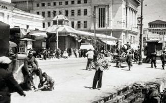 Κομματικά στελέχη και πολιτοφύλακες μπροστά από την είσοδο των γραφείων της Λαϊκής Πολιτοφυλακής Καισαριανής στην οδό Φιλαδέλφειας απέναντι από το σημερινό δημαρχείο της πόλης