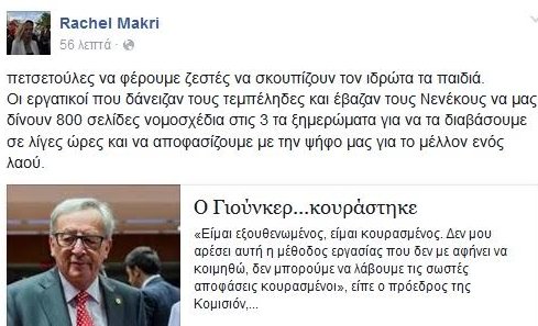 Με ένα ειρωνικό στάτους στον προσωπικό της λογαριασμό στο facebook, θέλησε να σχολιάσει η Ραχήλ Μακρή τη δήλωσε του Ζαν Κλοντ Γιούνκερ ότι είναι εξουθενωμένος από τις μεταμεσονύχτιες διαπραγματεύσεις.