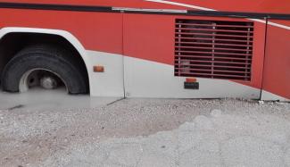 Αποτέλεσμα ήταν το πίσω μέρος του λεωφορείου να «βουλιάξει» στο σημείο και να ακινητοποιηθεί. Ο οδηγός βγήκε έκπληκτος και είδε τις εικόνες που κάνουν το γύρο των social media.