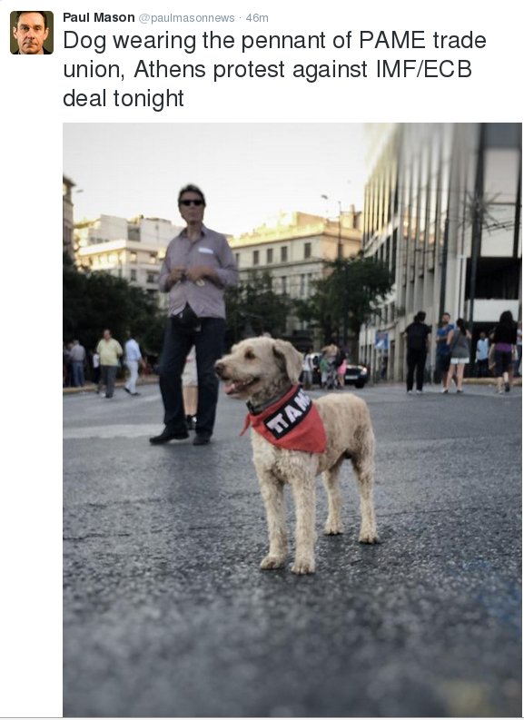 Στο μεταξύ, η συγκέντρωση κέντρισε το ενδιαφέρον και του Πολ Μέισον, με τον Βρετανό δημοσιογράφο του Channel 4 που βρίσκεται στην Αθήνα αυτές τις ημέρες να δημοσιεύει στο Twitter φωτογραφία ενός σκύλου... διαδηλωτή, με μαντήλι του ΠΑΜΕ στο λαιμό του.