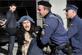 Αρχικά ακούστηκαν οι φωνές της και στην συνέχεια, η Ελένη Λουκά εμφανίστηκε στο πλάνο να γλιστρά και να πέφτει στην προσπάθειά της να ξεφύγει από τους αστυνομικούς. Εκείνοι στην συνέχεια σηκώνοντας την απομάκρυναν από το χώρο.
