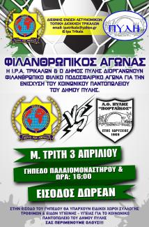 Σας γνωρίζουμε ότι το Δ.Σ. της Τοπικής Διοίκησης Τρικάλων της Διεθνούς Ένωσης Αστυνομικών, αντιλαμβανόμενο την δύσκολη οικονομική κατάσταση που βιώνουν πολλοί συμπολίτες μας, οι οποίοι αδυνατούν να εξασφαλίσουν ακόμη και τα «προς το ζην», αλλά και αναγνωρίζοντας παράλληλα το έργο και τη στήριξη που παρέχει σε αυτούς το «Κοινωνικό Παντοπωλείο» του Δήμου Πύλης, αποφάσισε ομόφωνα σε συνεργασία με το Δ. Πύλης την διοργάνωση, την 3η Απριλίου 2018, ημέρα Μ. Τρίτη και ώρα 16.00, φιλικό αγώνα ποδοσφαίρου στο γήπεδο Παλαιομοναστήρου μεταξύ της ομάδας της Τοπικής Διοίκησης Τρικάλων της Διεθνούς Ένωσης Αστυνομικών και του Α.Ο. Πορταϊκού , με φιλανθρωπικό χαρακτήρα, με απώτερο σκοπό την συγκέντρωση τροφίμων- ειδών καθαριότητας- ειδών υγείας & υγιεινής, από όσους επιθυμούν, προς ενίσχυση του Κοινωνικού Παντοπωλείου του Δήμου Πύλης, εν όψει των εορτών του Πάσχα.
