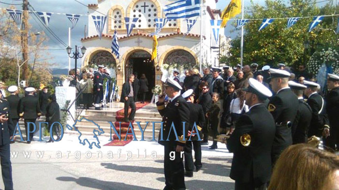 Θλίψη και συγκίνηση αυτή την ώρα στην Άρια Ναυπλίου όπου τελείται η εξόδιος ακολουθία του συγκυβερνήτη του ελικοπτερου Agusta Bell 212 του Πολεμικού Ναυτικού που συνετρίβη στην Κίναρο την Πέμπτη.