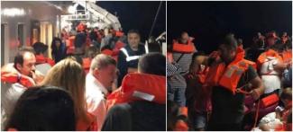 Στα social media κυκλοφόρησαν οι πρώτες φωτογραφίες με τους επιβάτες ανήσυχους στο κατάστρωμα και στο βάθος τα πλοία που έσπευσαν για βοήθεια.