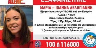 Στις 08/11/2019, και ώρα 14:00 μ.μ., εξαφανίστηκε από την Κατερίνη, η Μαρία – Ιωάννα Δεληγιάννη, 17 ετών. «Το Χαμόγελο του Παιδιού» ενημερώθηκε χθες, 12/11/2019, απογευματινές ώρες και προβαίνει στην ενεργοποίηση του συναγερμού Amber Alert κατόπιν συναίνεσης των Αστυνομικών Αρχών.