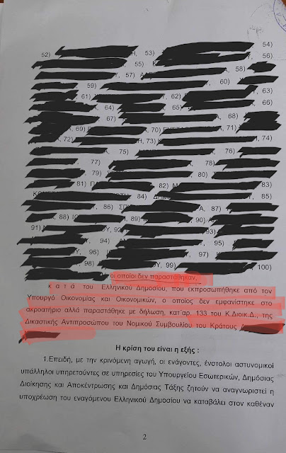 Το έγγραφο που μου εστάλη δείχνει ότι δεν παρασταθήκαμε στη δίκη για τις πρώτες 100 (εκατό) αγωγές αλφαβητικά, ενώ το κράτος ως αντίδικος παραστάθηκε διά εξουσιοδοτήσεως του Υπουργού Οικονομίας και Οικονομικών στην Δικαστική Αντιπρόσωπο του Νομικού Συμβουλίου του Κράτους.