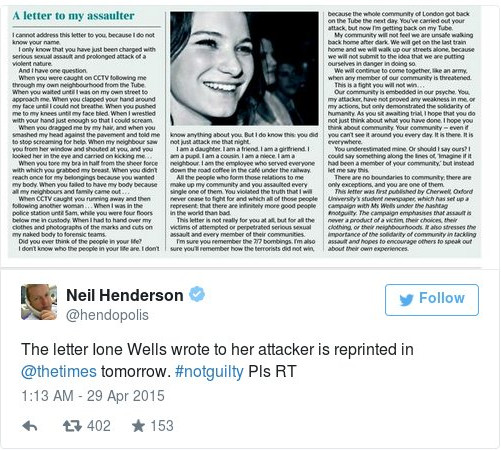 Η καμπάνια NotGuilty της Ione Wells είχε μεγάλη ανταπόκριση από τον κόσμο. Αξίζει να σημειωθεί ότι η Μητροπολιτική Αστυνομία δήλωσε ότι ένας 17χρονος κατηγορήθηκε για σεξουαλική επίθεση και θα παρουσιαστεί στο δικαστήριο στις 6 Μαΐου. Ο κατηγορούμενος δεν έχει κατονομαστεί.