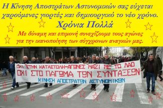Η Κίνηση Αποστράτων Αστυνομικών καλεί όλους τους απόστρατους να μετουσιώσουν και αυτή την εμπειρία και τα αισθήματά τους σε μαζικούς διεκδικητικούς αγώνες. Να βρεθούμε μετά τις γιορτές στους δρόμους, πιο δυνατοί και αποφασισμένοι, για να απαιτήσουμε δικαίωση και να αντιπαλέψουμε τις αντιλαϊκές πολιτικές που μας εξαθλιώνουν, μαζί με όλους τους συνταξιούχους και το αγωνιστικό εργατικό κίνημα.