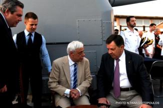 Η φωτογραφία είναι του Νίκου Παναγιωτόπουλου από την τελευταία εκδήλωση για το ΒΕΛΟΣ. Παυλοπουλος και Χηνοφώτης "τα λένε" υπό το βλέμμα του ΥΕΘΑ Πάνου Καμμένου.
