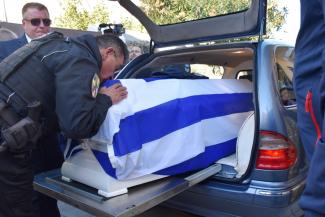 Δύο άνδρες της ομάδας ΔΙΑΣ και δύο από το αστυνομικό τμήμα της Λευκάδας κρατούσαν στα χέρια τους το φέρετρο με τη σωρό της Αφροδίτης καλυμμένο με την Ελληνική σημαία.