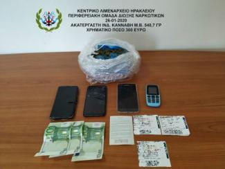 Συγκεκριμένα, σε έλεγχο που διενεργήθηκε στον 29χρονο και τον 21χρονο στον λιμένα Ηρακλείου κατά την αποβίβασή τους από Ε/Γ-Ο/Γ πλοίο, ο 29χρονος βρέθηκε να κατέχει εντός σακιδίου πλάτης μία (01) νάιλον συσκευασία, περιέχουσα φυτικά αποσπάσματα ακατέργαστης ινδικής κάνναβης μικτού βάρους πεντακοσίων σαράντα οκτώ γραμμαρίων και επτά δεκάτων του γραμμαρίου (548,7 gr), ενώ ο 21χρονος κατείχε και επέδειξε ταξιδιωτικό έγγραφο που ανήκει σε άλλο πρόσωπο.