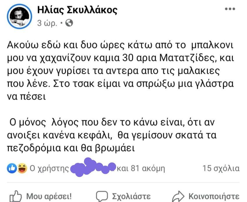 Ο κ. Ηλίας Σκυλλάκος, δημοσιογράφος, με δημόσιο λόγο, και ως εκ τούτου με αυξημένη ευθύνη, στον δημόσια προσβάσιμο λογαριασμό του στο facebook την 6-12-2020, έκανε την εξής ανάρτηση :