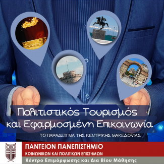 Σε αυτό το πλαίσιο, το Κέντρο Δια Βίου Μάθησης (ΚΕΔΙΒΙΜ) του Παντείου Πανεπιστημίου και το ΚΕΔΙΒΙΜ Easy Education διοργανώνουν το πρόγραμμα «Πολιτιστικός Τουρισμός και εφαρμοσμένη επικοινωνία. Το παράδειγμα της Κεντρικής Μακεδονίας». Κατά τη διάρκειά του θα αξιοποιηθούν σημαντικά παραδείγματα πολιτιστικών πόρων, τα οποία με τη συνδρομή της τεχνολογίας και των ψηφιακών μέσων επικοινωνίας μπορούν να προβληθούν σ’ ένα διευρυμένο κοινό.