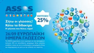 Με αφορμή την ευρωπαική ημέρα των γλωσσών στις 26 Σεπτεμβρίου τα ASSOS προσφέρουν έκπτωση -25% σε οποιαδήποτε ξένη γλώσσα επιλέξετε. Η προσφορά ισχύει και για τα συνδυασμένα προγράμμτα ξένης γλώσσας και πληροφορικής!