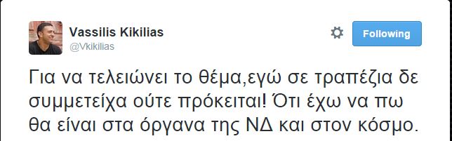 Ο κ. Κικίλιας, με έντονο ύφος, δίνει τέλος στα σενάρια που τον θέλουν να συμμετέχει στα γεύματα με θέμα την ηγεσία, με ανάρτηση στον προσωπικό του λογαριασμό στο Twitter: «Για να τελειώνει το θέμα, εγώ σε τραπέζι δεν συμμετείχα ούτε πρόκειται! Ο,τι έχω να πω θα είναι στα όργανα της ΝΔ και τον κόσμο».
